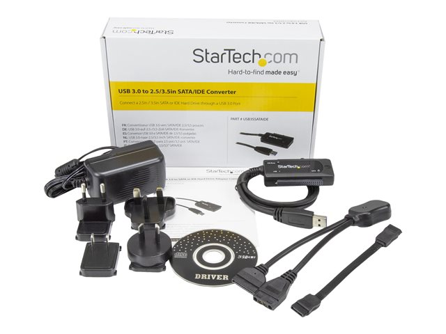 Le câble adaptateur USB 3.0 vers IDE/SATA USB3SSATAIDE connecte tout disque dur SATA 2,5/3,5 pouces ou IDE standard à un ordinateur via un port USB 3.0 (rétrocompatible avec USB 2.0). Cet adaptateur vous permet de connecter un lecteur seul, sans boîtier, vous permettant ainsi d'éviter toute perte de temps ou difficulté.