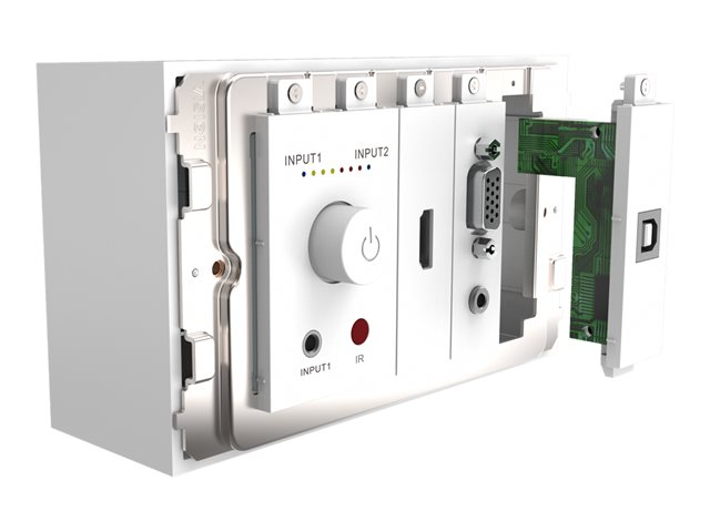 Contenu de l'emballage1 x 2-Gang UK Backbox, 1 x 2-Gang Surround, 1 x VGA avec module enclenchable miniprise, 1 x module enclenchable USB (type B à l'avant), 1 module enclenchable HDMI, 3 panneaux vides